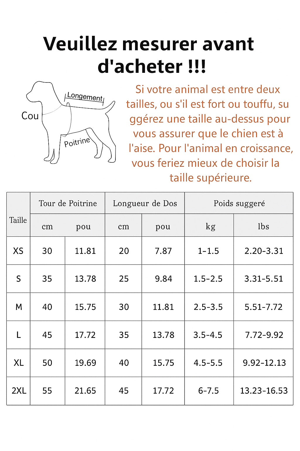 2XL : Tour de poitrine 55 cm / 21,65'' ; Longueur 45 cm / 17,72'' ; Poids conseillé 6–7,5 kg / 13,23–16,53 lbs.