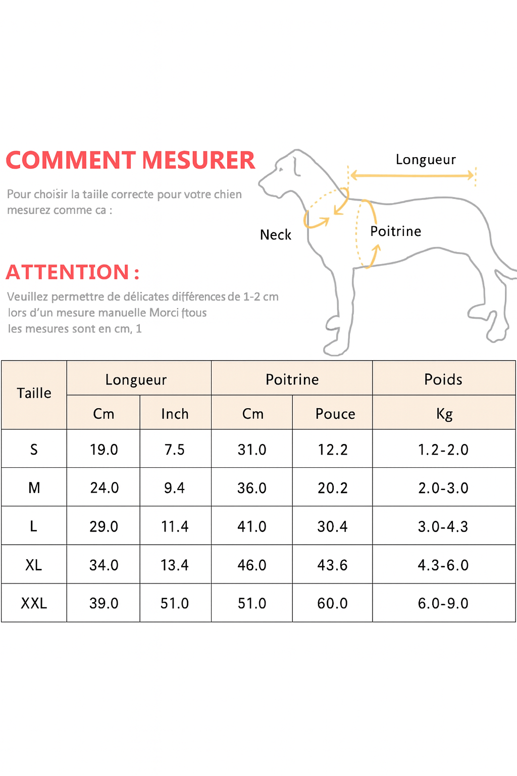 - Veuillez vérifier les mensurations de votre animal afin de vous assurer que le vêtement lui convient avant de passer commande (1 pouce = 2,54 cm).
